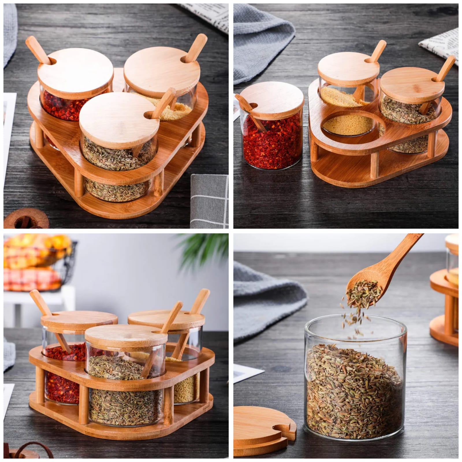 3 PCS GLASS SPICE CONTAINERS(15OZ) WITH BAMBOO HOLDER