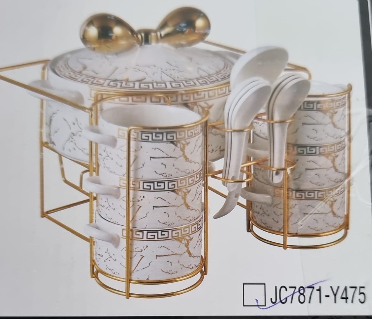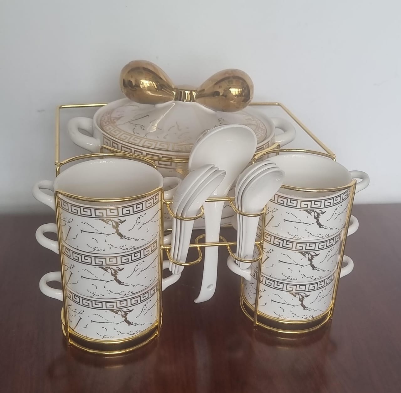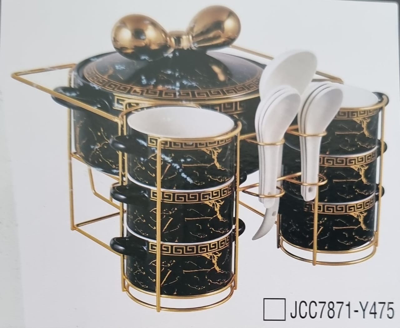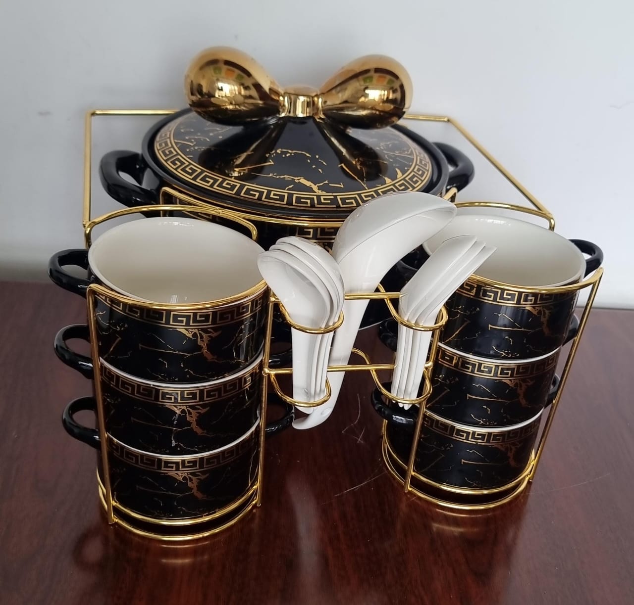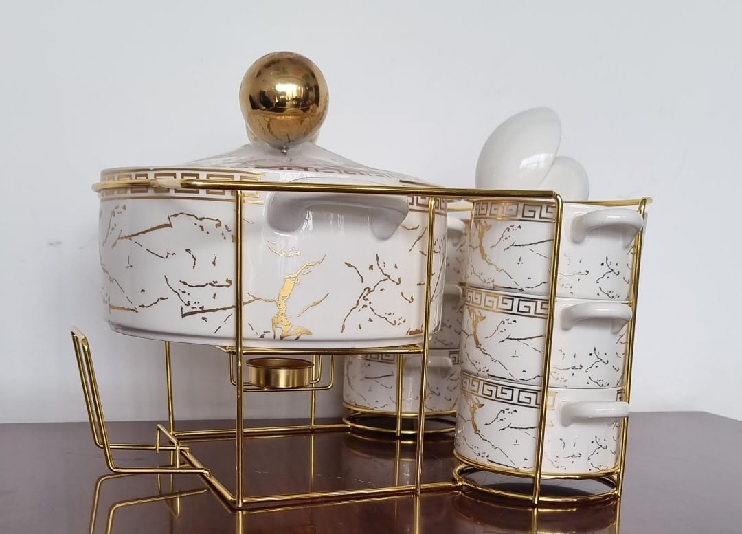 Ceramic marble-like soup bowls 1 soup touren on bamboo base + burner 6500/-